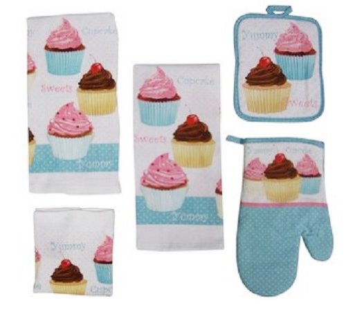 7 Piece Too Cute Cupcake Kitchen Dish Towels Set With Pot Holders